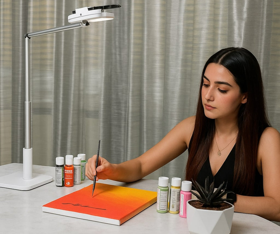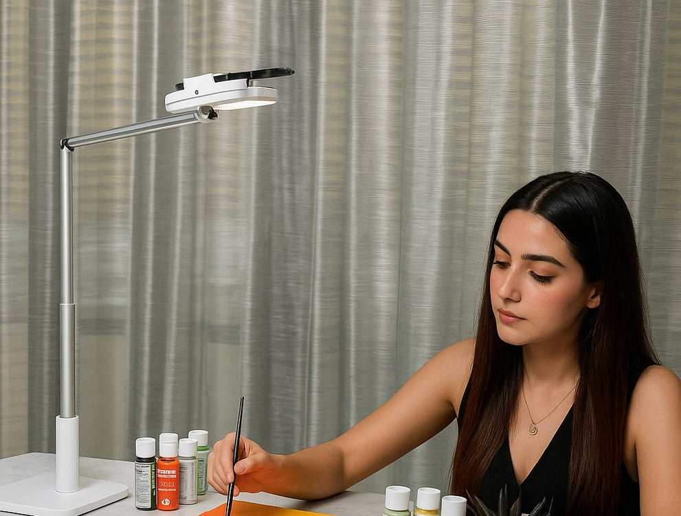 Dépliez le support, fixez votre appareil, ajustez l’éclairage… et créez.